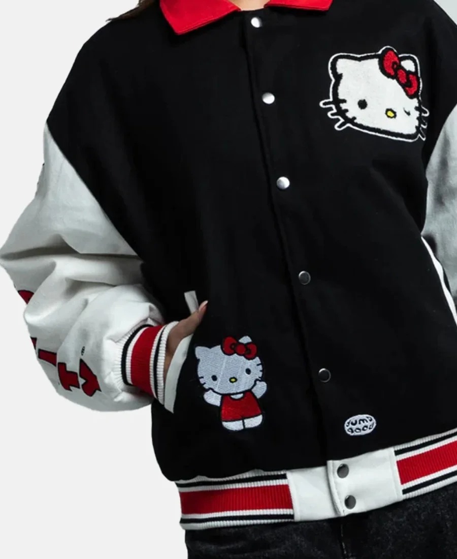 Stylish Hello Kitty black and white varsity jacket with iconic character design.