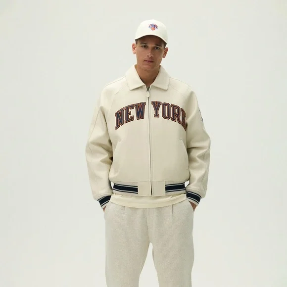 Crafted in a unique Sandrift colorway, this piece stands apart from traditional team jackets. The premium materials—featuring leather, nylon, and classic ribbed trims—embody the quality expected from both houses. The Avirex bomber jacket silhouette is instantly recognizable, now reimagined with bold Knicks branding and the iconic co-branded patch on the sleeve. This Kith Avirex Knicks Jacket is designed for the fan who views their loyalty as a core part of their personal style.