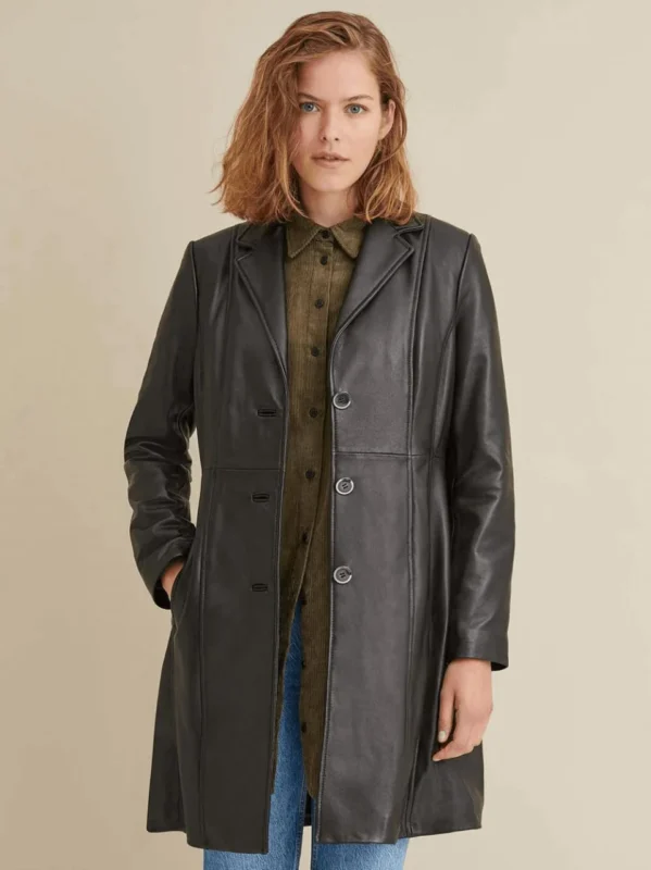 Women’s Classic Black Leather Long Trench Coat
