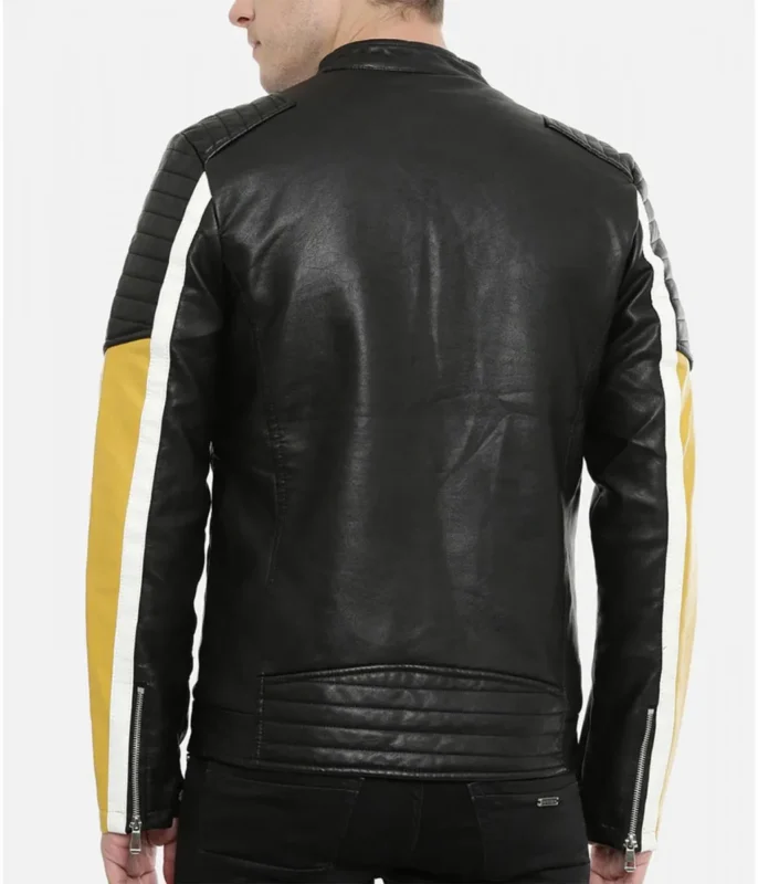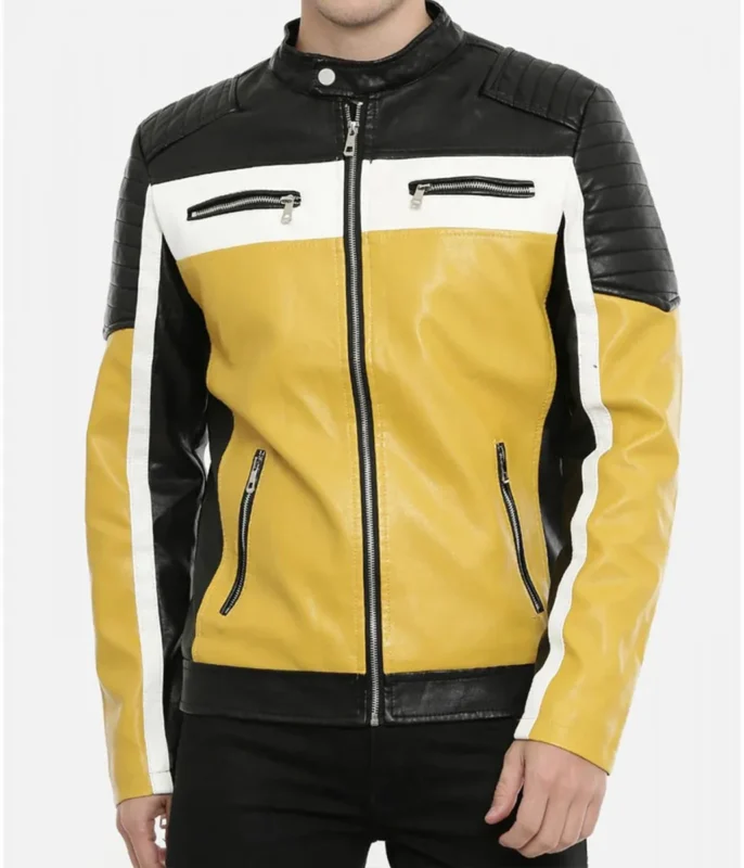 Men’s Biker Yellow and Black Color Block Quilted Leather Jacket